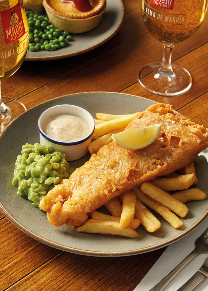 Beer-battered fish & chips, with your choice of garden or mushy peas (†) | 14.29 1095 kcals