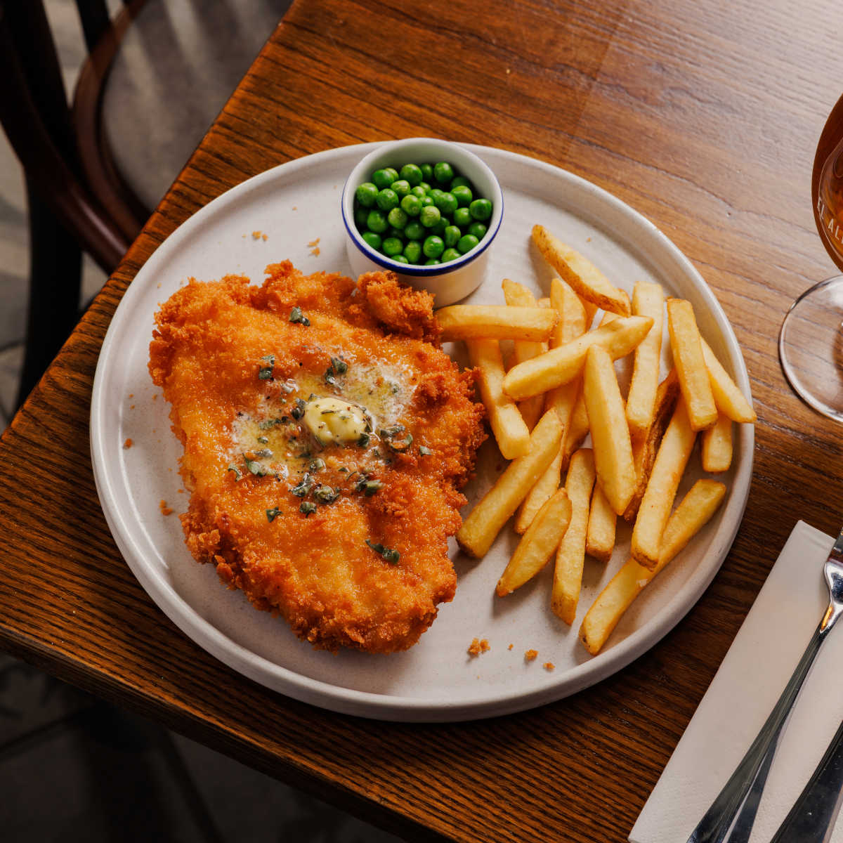 Crispy chicken schnitzel, breaded chicken topped with garlic butter, with chips and garden peas | 14.99 1364 kcals