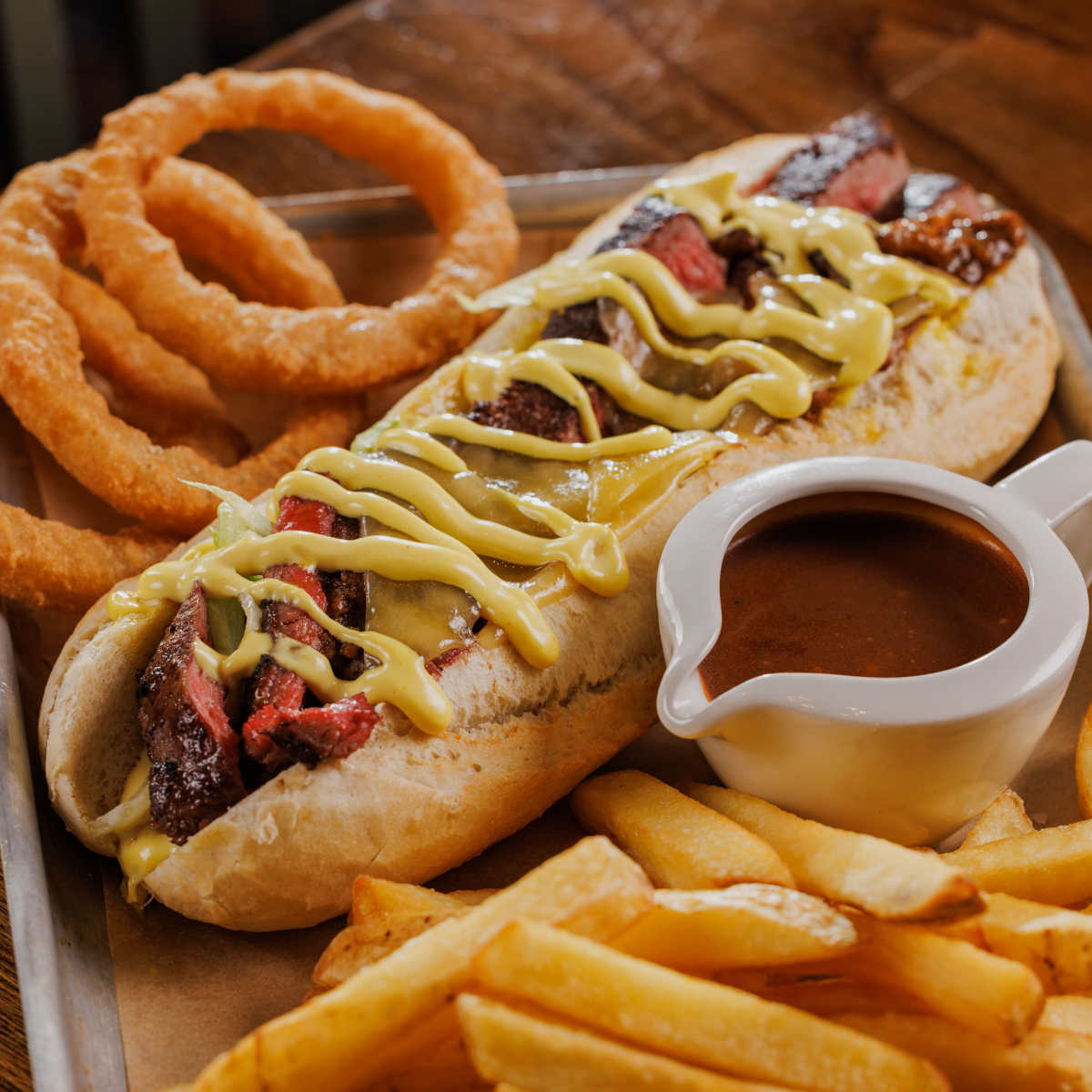 Ultimate steak dipper, steak, melted cheese and rich beef gravy in a crusty baguette, with crispy onion rings, chips and a pot of gravy for dipping | 14.99 1886 kcals