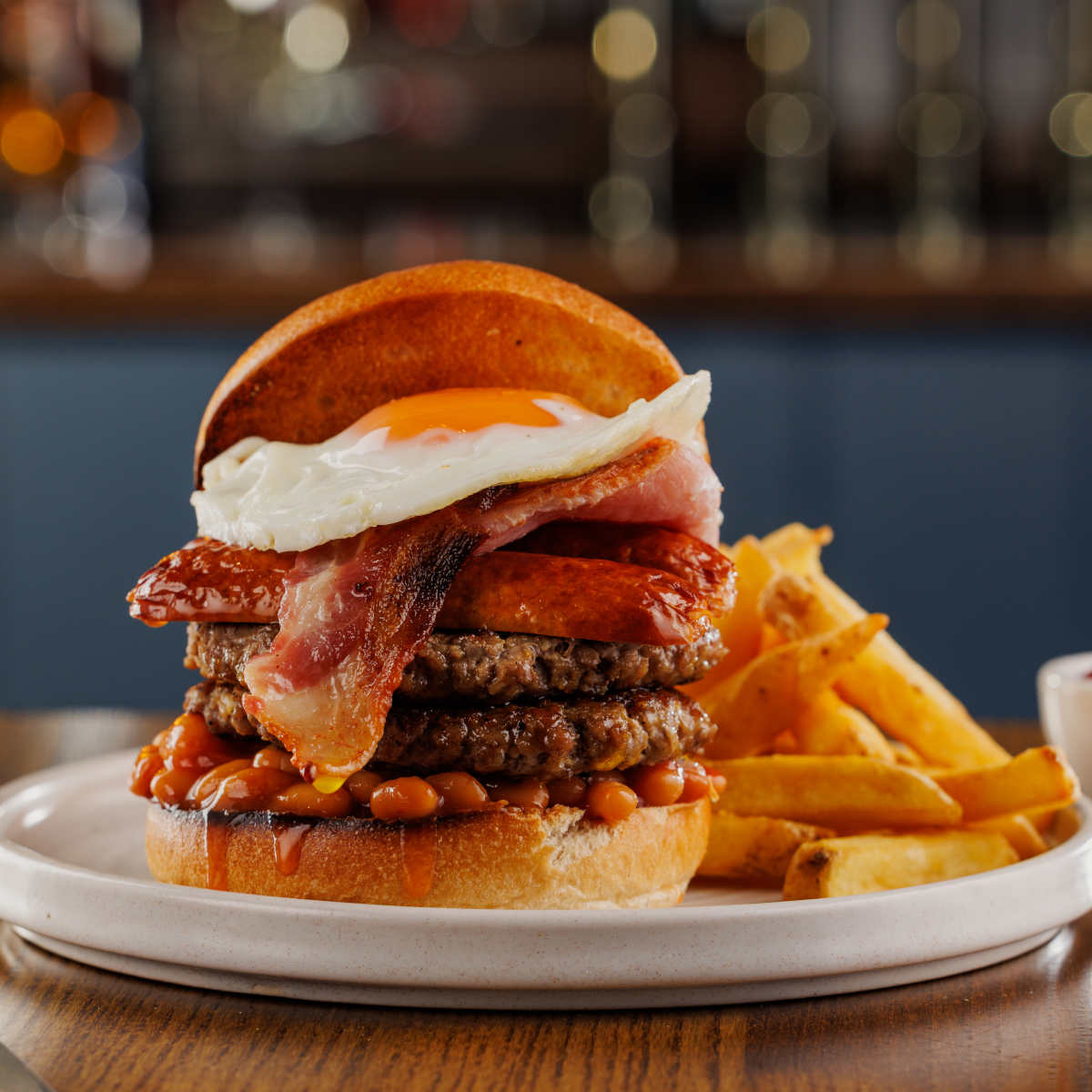 All day breakfast, two pork sausages, two bacon rashers, two free-range fried eggs, grilled tomato, mushrooms, chips and baked beans | 14.29 1270 kcals